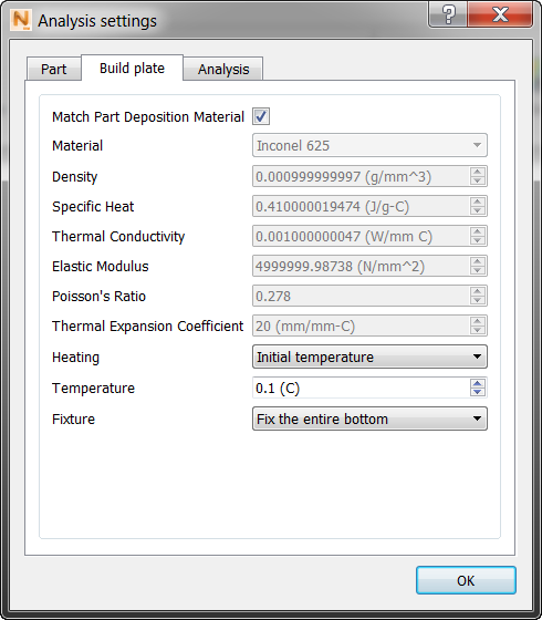 - On the Build Plate tab, select either to match the part material, or select a different material from the drop-down list.