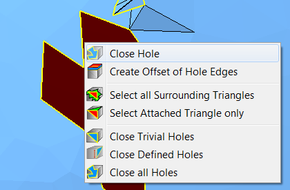 The context menu of an open triangle border edge has the option Close Hole the context menu. This closes individual holes and leaves inserted triangles selected. Open triangle edges are highlighted in yellow. This can be toggled in the Status tabsheet.