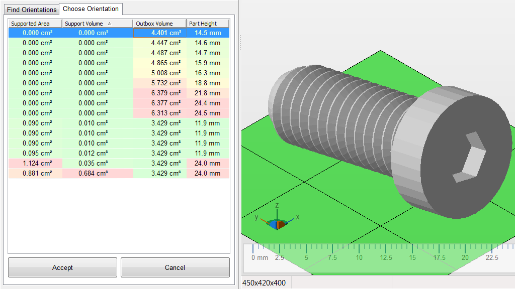 The orientation of a part for manufacturing is affected by a number of considerations. This module analyzes a part by and calculates several suggestions for orientation. These suggestions are determined heuristically based on support minima, and are listed with an array of additional values which are displayed color-coded for easier identification of which one to prefer. By clicking a suggestion, the orientation is visualized and can then be applied or reset.