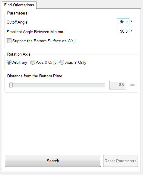 Netfabb will attempt to find a number of rotation variations where the surface requiring support is at a minimum from a set of user-defined values. Only the actual surface is taken into account, triangle density does not matter.