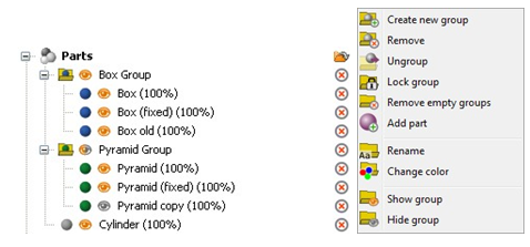 Parts can be grouped via context menu in the Project Tree. You can either create a new, empty group and then add parts, or create a group from currently selected parts. Parts can then be added to the group or moved out of the group by drag & drop within the Project Tree.