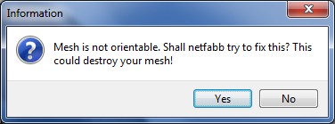 If the part is not orientable, a dialog is opened where you will be asked if Netfabb should try to make it orientable. However, as a warning, this does not always work and may destroy the mesh. So, to be sure, it is recommended that you apply the repair before executing this function, optionally without replacing the original, and start the repair module again. Not orientable surfaces can come into being for instance because of self-intersections, or after the orientation is ignored during the stitching of triangles.