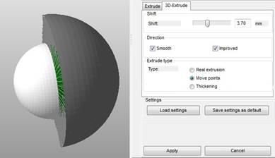3D Extrusion also enables you to thicken the walls of a part. Select the Thickening option in the extrude type window. After completing the thickening process it is necessary to run the extended repair script or at least use remove intersections. Otherwise the part will have some intersections and flipped triangles, causing issues with other modules (for example support) or when printing the part.