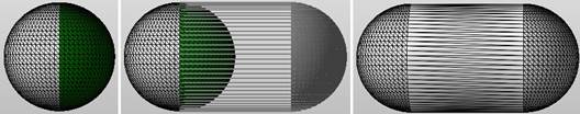 If the option Move Points is activated, the module does not add new triangles to expand the part, but simply moves the points of the selected triangles. That way, all neighboring triangles are repositioned to connect the old part and the new surfaces. This can lead to a different kind of shape as the standard extrusion. The direction of the extrusion along the three axes and the distance to the original surface can also be set in the parameters box in the tabsheet to the right. You have three fields for the direction, representing the X-, Y- and Z-axes. The proportion of the number you enter here determines the direction of the extrusion.
