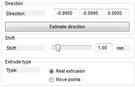 The button Estimate Direction calculates the average orientation of all selected triangles and aligns the extrusion in that direction. This is most helpful for extruding surfaces whose triangles are not parallel. The average direction of the triangles is also set automatically at the start of the feature.