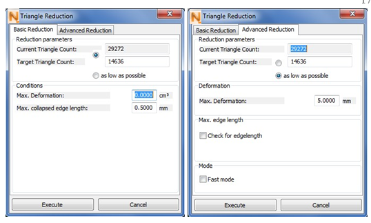 In both dialog boxes, you can see how many triangles are selected and you can set, if you want to reduce the triangle count to a certain target count or if you simply want to reach the lowest possible number of triangles. If the triangle mesh is very much finer than necessary, it is recommended to conduct the triangle reduction in several steps, for example halving the triangle count. Otherwise, you may get unwanted side effect like double surfaces.