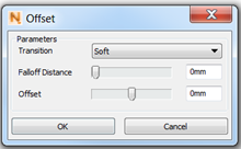 This feature allows you to apply offsets to selective areas of the part. To do so use the selection tools to define the area which shall be offset. Then go to mesh edit and choose the selective offset. Here you set the offset distance along with the fallout distance. The fallout distance chooses which area around the selected triangles should be affected by the operation and will move up to the offset by creating a slope. You can select a soft and a hard offset, which will affect how smooth the corners of the slope are going to be.