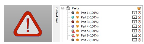 Whenever any part is damaged and therefore cannot be used for 3D printing, a large warning sign with an exclamation mark is displayed in the bottom right of the viewing screen, and a little warning sign is placed next to the part in the project tree. Before building these parts, they must be repaired.