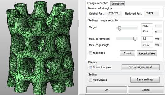 In the Display options you can make the mesh visible (Show triangles) and by pressing and holding the Show original mesh button you’ll get to review the triangulation before you reduced it. With a check in the Auto update box, all the changes you make will be displayed on the model immediately. This is very useful for checking the new mesh with every change, but can lead to long calculation times when working with complex files. If you always want to use the same reduction settings on all your models, click on Save settings to make them available later. Apply your calculations by pressing OK.