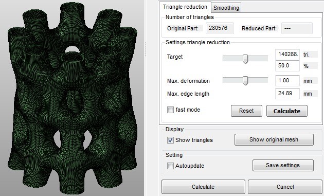 In the Settings below, reduce the triangle count to a maximum deformation represents the maximum change in the surface of the part. The maximum edge length determines the maximum length of edges which are unified. Please note that wrong condition settings, for example extremely high values, may lead to unsatisfying results, such as strong distortion or self-intersections. You can choose the Fast mode, which works faster but a little less accurate. Show a preview of the reduction by clicking on Calculate and if you want to get back to the original mesh, press Reset.