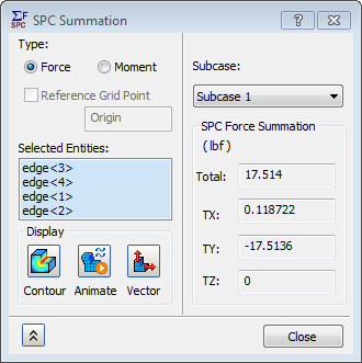 - Looking at the individual reaction forces of each hole for Subcase 1 (using the methods described above), the results should be similar to what is shown below for the SPC Force Summation.
