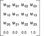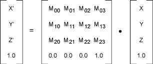 The functions that pass arguments of the ads_matrix type treat a point as a column vector of dimension 4. The point is expressed in homogeneous coordinates, where the fourth element of the point vector is a scale factor that is normally set to 1.0. The final row of the matrix has the nominal value of [0,0,0,1]; it is ignored by the functions that pass ads_matrix arguments. In this case, the following matrix multiplication results from the application of a transformation to a point: