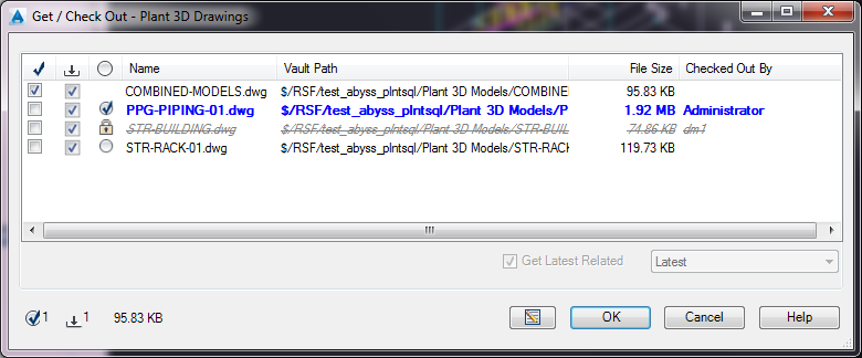 If you get or check out a file that references other drawing files (Xref), the referenced drawings are added to the check-out dialog box and are downloaded automatically (for example: if you check out combined-models.dwg the three additional files it references are added to the list).