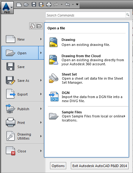 The Application menu, located in the top-left corner of the program, replaces the traditional menu structure you might be familiar with in previous releases of AutoCAD P&ID.