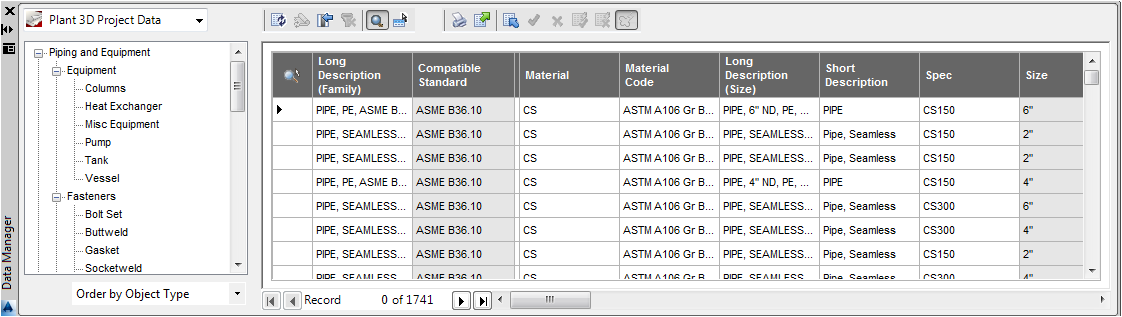 The Data Manager provides a window onto your Plant data. You can view, modify, export, and import drawing and project data, and generate reports using the Data Manager.