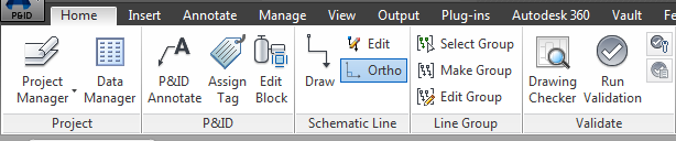 The P&ID Home tab displays options for working with P&ID drawings. This tab includes the following panels: