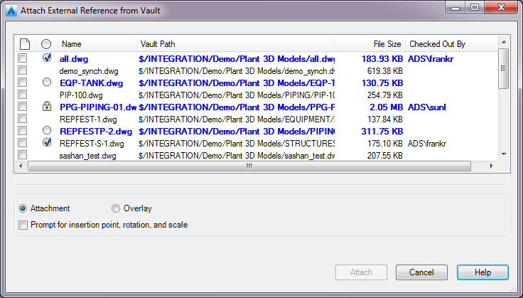 Allows you to attach a project file directly from the vault. The xref file does not first need to be downloaded to the local workspace.