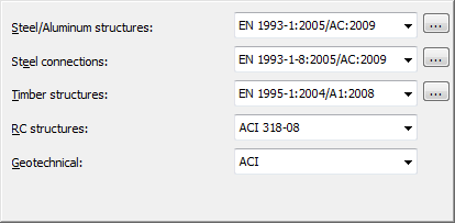 - RC - Click the arrow at the end of this field to select the codes required for RC structure element design. After calculating reinforcement for these structure elements, you obtain the provided reinforcement area and distribution of reinforcement in an RC structure element.