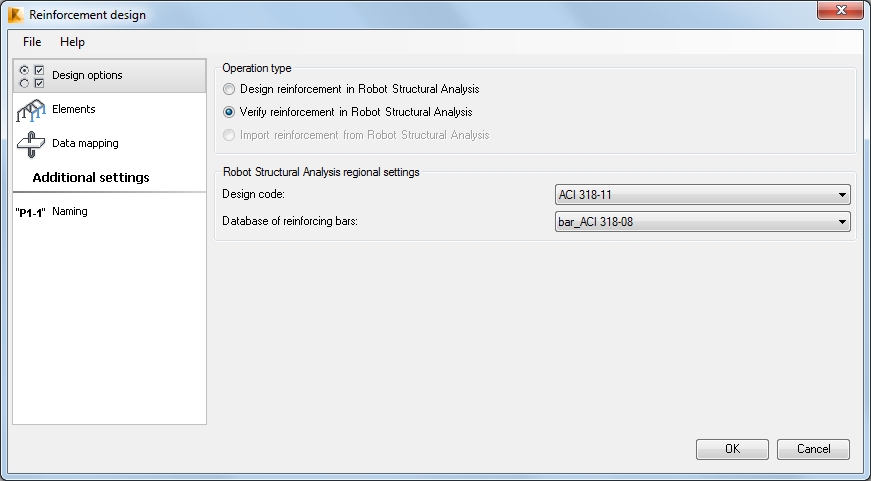 The Naming tab is available for design and verification modes. It applies only to elements for which the Mark parameter is not defined. Use it to define a name prefix for Robot RC elements.