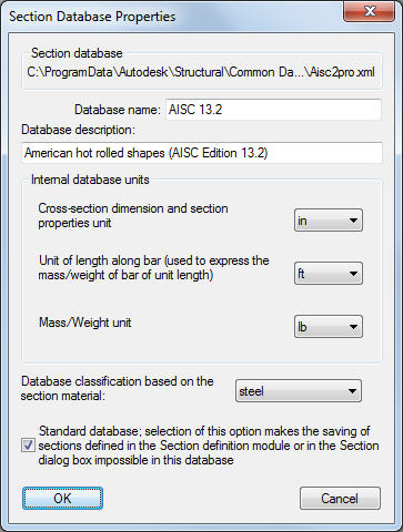 - The Standard Database. When selected, you cannot save sections defined in the Section Definition module or in the Sections dialog box in this database.