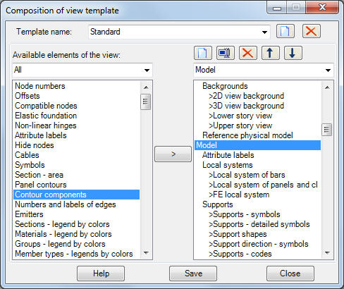 Available elements of the view contains all categories which are indicated in blue in the Display dialog. Click > to move selected categories to the right panel which contains parameters of the currently defined/modified template . A tree display of groups and objects belonging to individual groups is built in the right panel. Elements transferred from the left to the right panel are placed in the group currently highlighted.