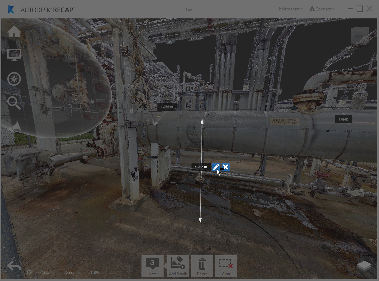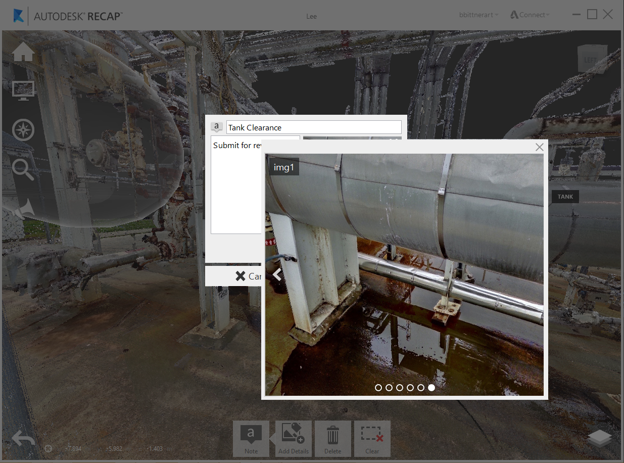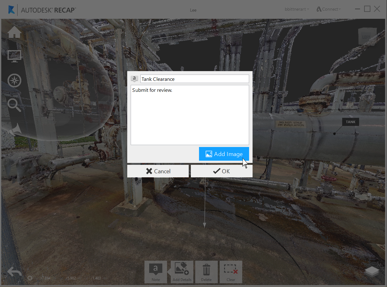 Any measurements, regions, markups, and selections created within ReCap 360, along with any general points within your project, can have notes assigned directly to them, allowing for a richer form of communication. Title and description text, along with image attachments, can be added to annotations at any point by selecting the "Note" tool either on the in-canvas object: