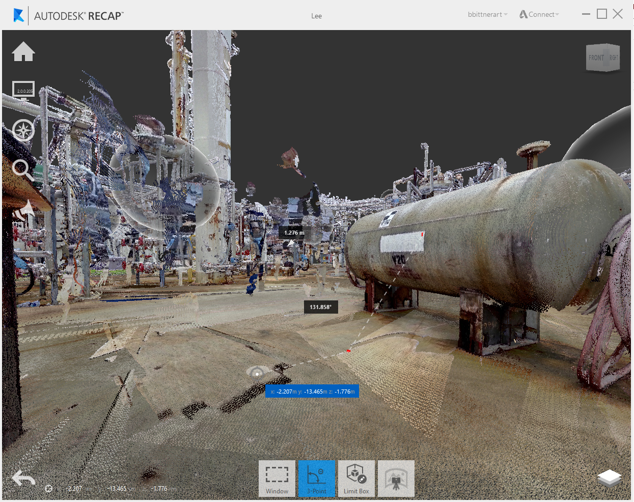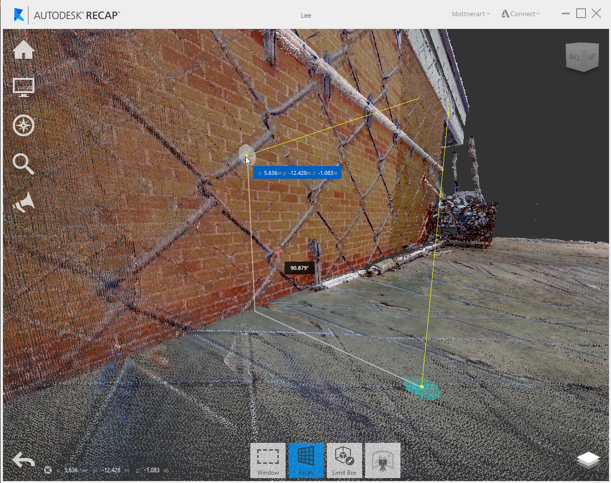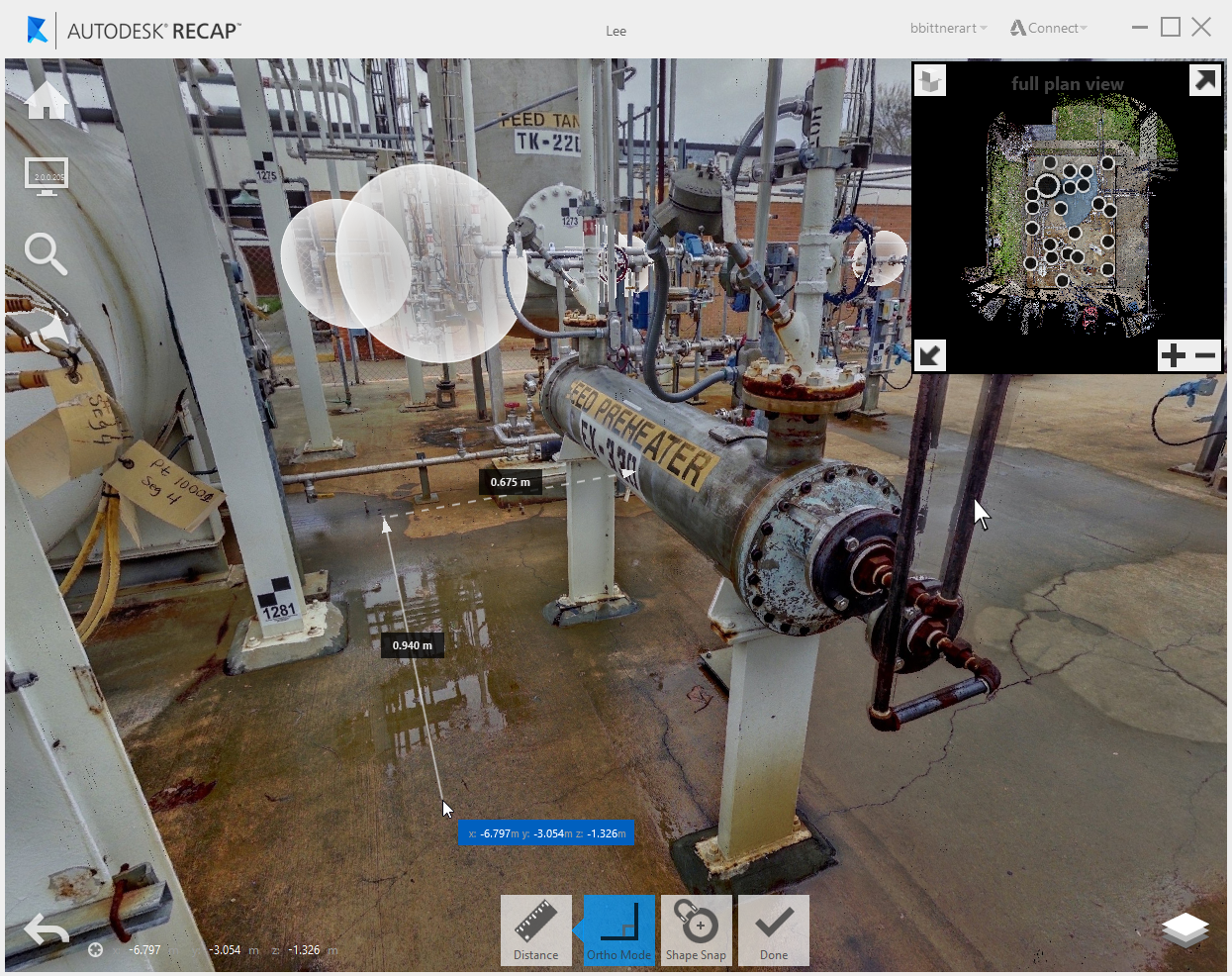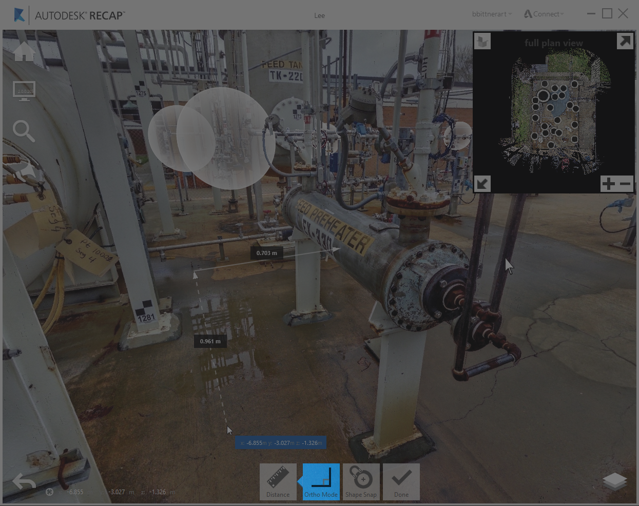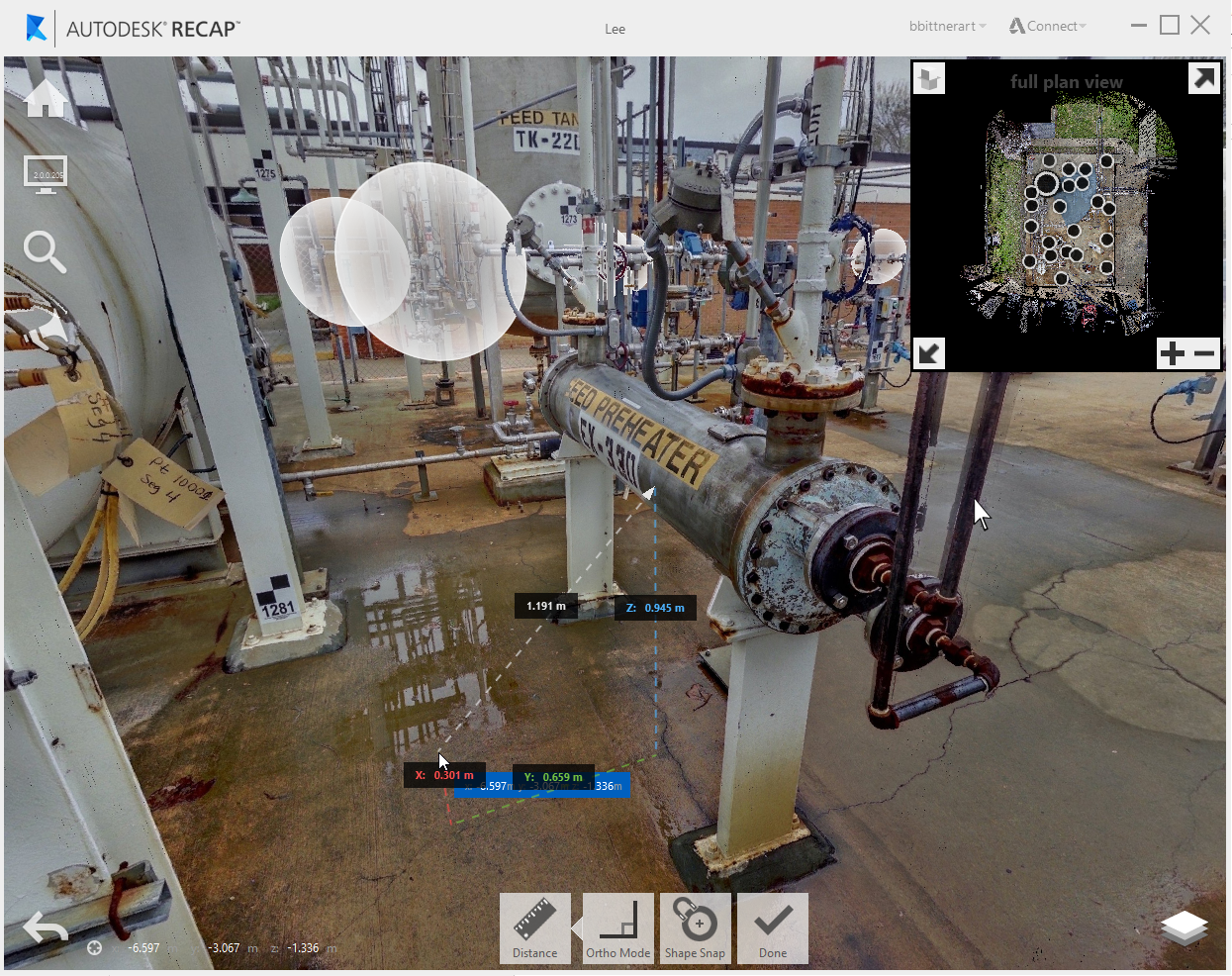 A number of extra features available within ReCap 360's distance features can reveal additional functionality for obtaining specific measurements. In the example above, we can see that the distance tool provides real-time feedback on the distance between the two primary points as well as secondary information around the scene's x, y and z planes.