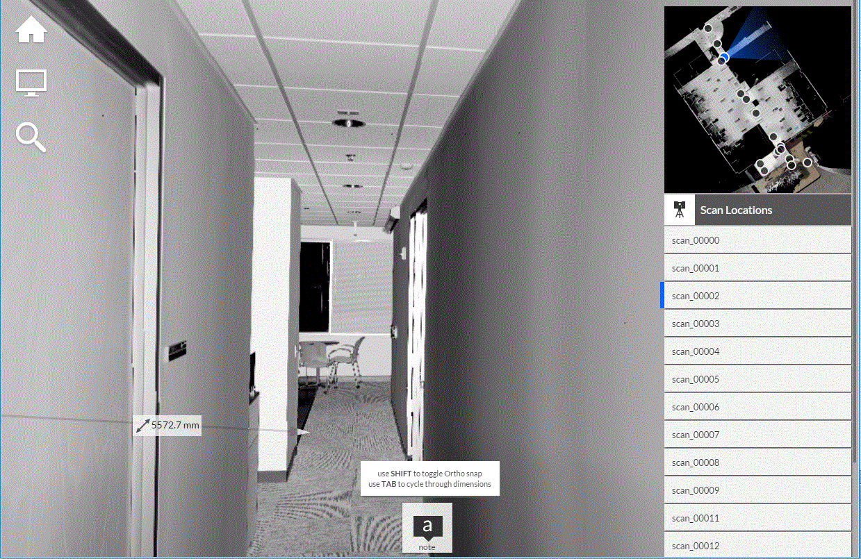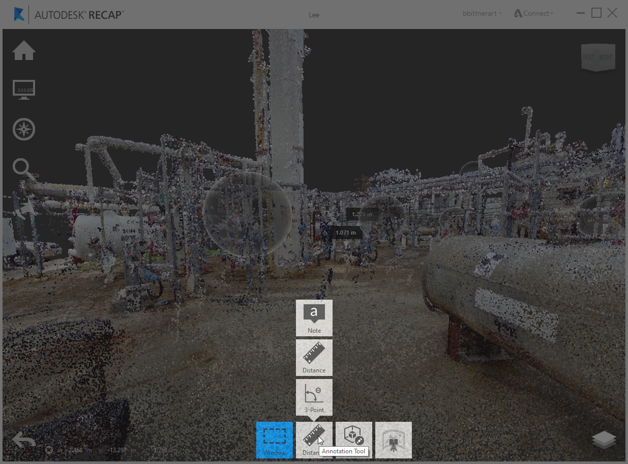 All measurements originate on the lower Contextual tile toolbar. For standard ReCap 360 users, this will provide access to the basic distance tools and the Note tool. Advanced measurement options are available only to ReCap 360 Pro users. Pro web users have a subset of this functionality available as well, but since it relies strictly on the RealView environment, some of the advanced measurement options are not available. Notes, Markup, Freehand, and Ortho measurements are available in the web interface.