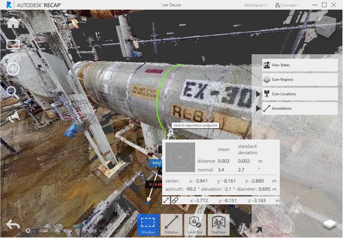 To choose your endpoint, simply move your cursor to the desired point and click. Endpoints can be alternately defined with the Pipe Snap tool by pressing Ctrl. Please note that using the Shift key to rotate through the other distance tools while in this mode will disable Surface Snap, and ReCap 360 will then use your starting point to begin measuring distance in the toggled mode.