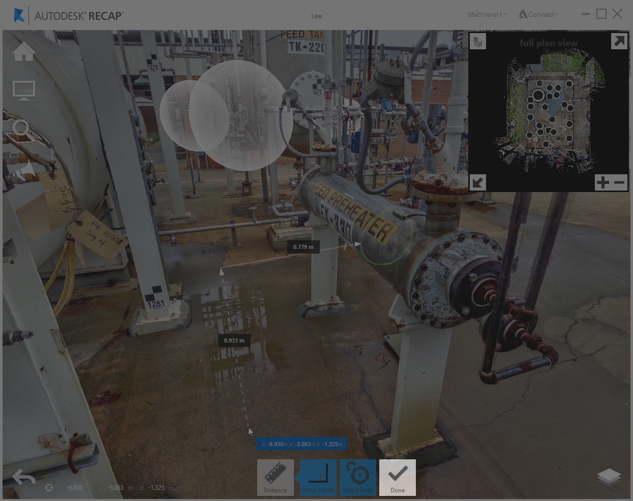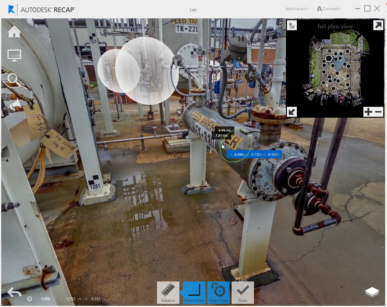 Additional precision can be achieved when working with piping or cylindrical objects with the Pipe Snap tool. When this mode is activated, either by selecting it directly through the Distance Menu or toggling it via CTRL while in the menu, ReCap 360 will automatically detect any cylindrical object under the cursor, snap to the cross section, and ultimately provide measurements from either the center or a point selected along the circumference.