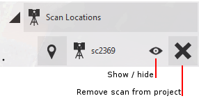 After they are incorporated into a project, the scan locations become less important, since the Scan Regions you create generally include more than one location. However, you can hide and show locations, or even remove them from a project if you need to simplify the view or remove extraneous areas of the point cloud. If you hide a scan location, it remains hidden, even when the Scan Region is visible.