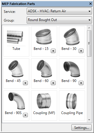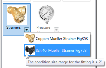 When you click the arrow, a drop-down list displays additional parts based on the size. This drop-down list is controlled by the conditions in the service definition, similar to routing preferences. For example, a bend may use a pressed bend up to a certain size, and a segmented bend above that size. When you place the cursor over a part in the list, a tooltip displays the size range based on the condition for that part.