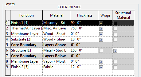 The position, thickness, and material for each layer and region are defined through the type properties of the wall, using the Edit Assembly dialog.
