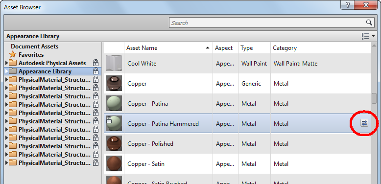 - In the Material Editor panel of the Material Browser dialog, click the tab for the asset to replace (for example, Appearance, Physical or Thermal), and then click the Replace Asset button
