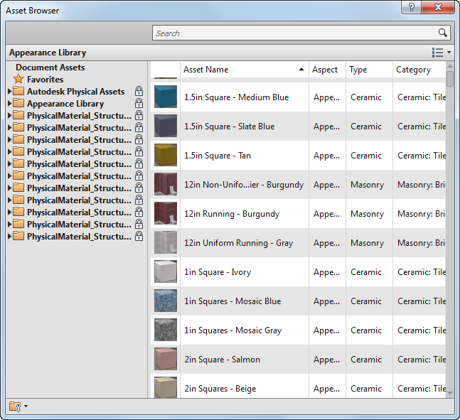 - From the Material Browser, add an asset to a material, modify the asset, apply the changes, and then replace the asset that is assigned to the material. Save the Revit project.