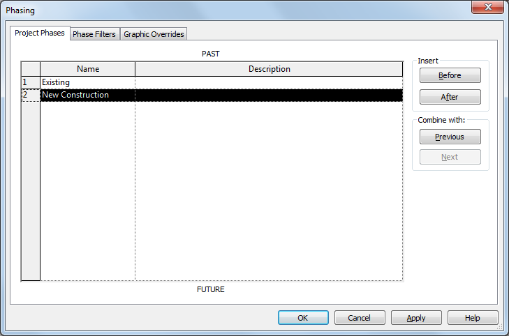 The Phasing dialog opens, displaying the Project Phases tab. By default, each project has phases called Existing and New Construction.