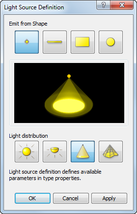 - For Emit from Shape, select the shape of the light to emit from the light source: Point, Line, Rectangle, or Circle.