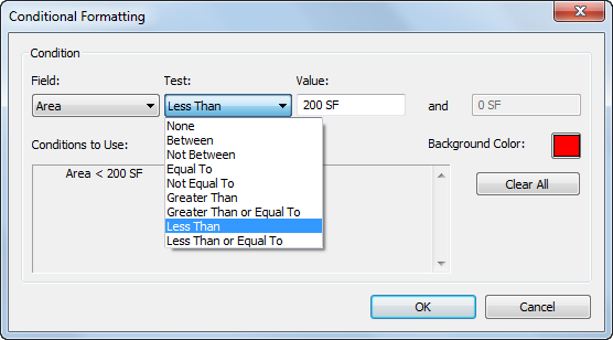 Example uses of conditional formatting include setting a condition to indicate that an area has a square footage under a specified minimum, or whether the correct amount of airflow is being supplied to each of the rooms in the model.
