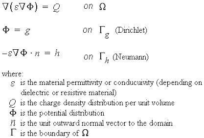 The governing partial differential equation (PDE) is the Poisson equation. This PDE is valid for both dielectric material (Electrostatic Field Strength and Voltage) and resistive material (Electrostatic Current and Voltage) analysis. The strong form of the problem is defined in the following section: