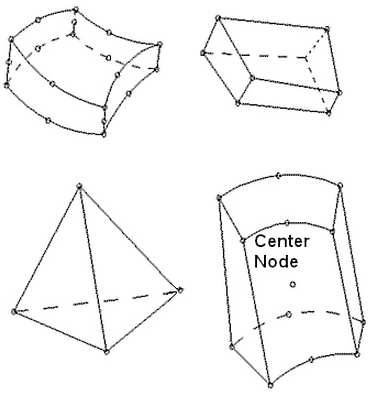 Brick elements are 8- to 21-node isoparametric or sub-parametric curvilinear hexahedra. Typical elements are illustrated in Figure 1. These elements may be used to model 3D solids or thick shells, such as the two examples in Figure 2.