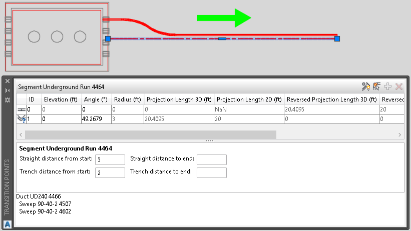 Transition point information is displayed in the palette. By default, the start and end points of the duct are provided. The following steps can be done both in 2D or 3D mode.