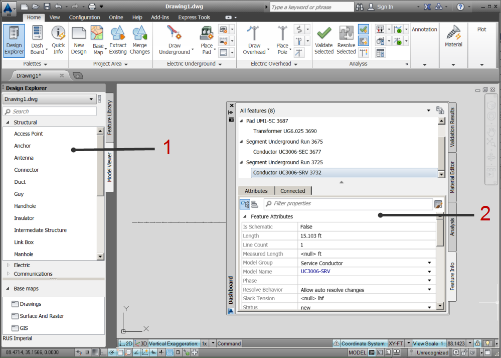 The Model Viewer tab lists all the feature classes in the industry model in your design drawing. You can toggle the display to list only the feature classes used in your design. For more information, see About the Model Viewer.