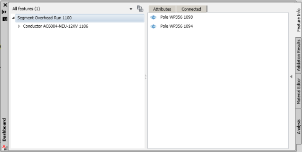 One pane displays the selected features in a tree view. Contained features are indented under the container feature. The other pane displays either feature attribute information or feature connection information, depending on the selected tab. You can change the layout of these panes by clicking .