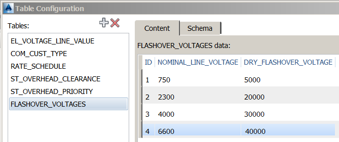 Use Table Configuration to set up tables of values. Then, create rules that look up values from the tables. This sample procedure creates a subrule to set Dry Flashover Voltage based on a conductor's Nominal Line Voltage. You can then create a validation rule with a resolution that looks up Nominal Line Voltage and sets the appropriate Dry Flashover Voltage. Adapt this procedure as needed.