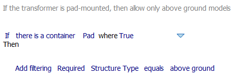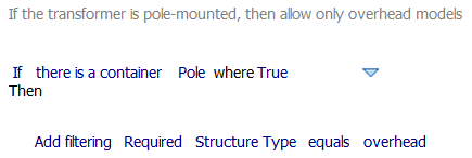 Sizing rules control the selection of appropriate models for features. This sample transformer sizing rule specifies that for pole-mounted transformers, only overhead models are allowed.