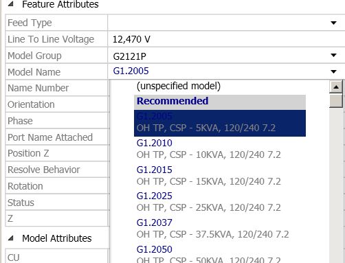 As a result of these sizing rules, only appropriate transformer models are shown in the Recommended group for the model attribute.