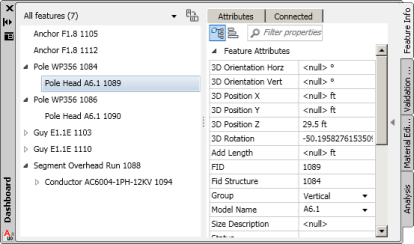 Feature Info to open the Dashboard with the Feature Info palette displayed. Contained features are displayed in a hierarchical view under the parent feature. Features that are connected to other features are indicated by the