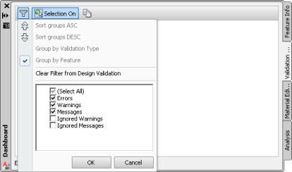 - Validation Results—As you create features, validation rules check for issues and display them in the Validation Results palette. Use the Filter option to specify which issues are displayed and how the information is organized. For more information, see About Design Validation.