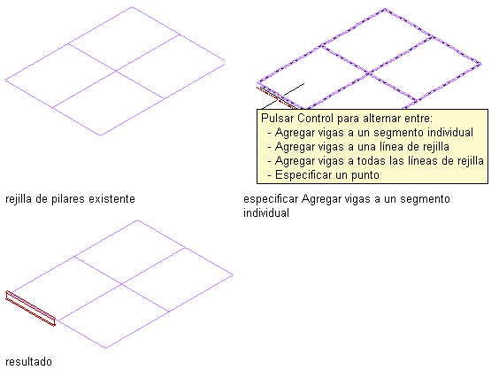 | agregar una viga a lo largo de uno o más segmentos de una rejilla de pilares (suponiendo que el tipo de diseño es Borde) | mueva el cursor por encima de un segmento de la rejilla para mostrar una vista preliminar de la viga y, a continuación, haga clic para agregar una viga a lo largo del segmento; también puede pulsar Ctrl y hacer clic para agregar vigas a lo largo de todos los segmentos de la línea de rejilla; asimismo, puede pulsar Ctrl dos veces y hacer clic para agregar vigas a lo largo de todos los segmentos de la rejilla. Pulse Intro para terminar el comando. |