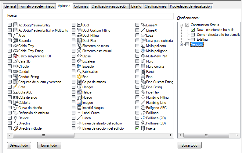 La definición de clasificación se enumera en la ficha Clasificaciones de las propiedades del estilo de objeto. En el estilo de objeto se selecciona una clasificación, como Nuevo. Por ejemplo, el dibujo puede contener determinados estilos de puerta para las puertas existentes y diferentes estilos para nueva construcción. Todas las puertas creadas a partir de estos estilos tienen la clasificación especificada en su estilo.